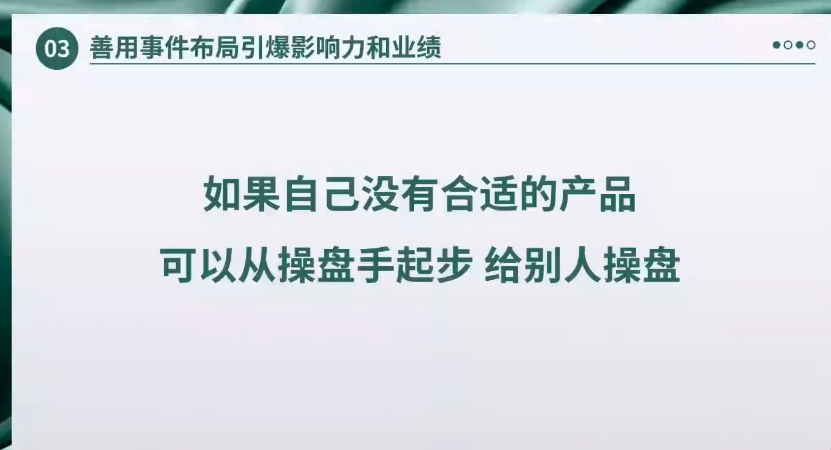 本密训班聚焦 IP 文案营销与私域转化,从核心能力到实操方法全面覆盖。课程不仅讲解文案力与个人品牌思维的商业价值放大路径,还传授美学营销思维提升私域转化率的技巧。同时拆解朋友圈成交底层逻辑,提供吸睛标题、收钱文案等爆款公式,更指导打造追剧式朋友圈、强能量高价成交圈,通过事件布局实现影响力与业绩双增长,助力学员突破 IP 运营卡点,掌握可落地的文案营销技能。
